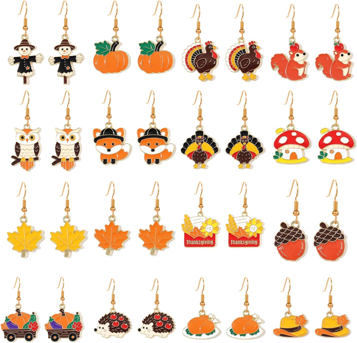 16 Pairs Fall Earrings for Women Thanksgiving Day Fall Pinecone Maple Leaf Pumpkin Mushroom Turkey Hedgehog Scarecrow Earring Set Holiday Earrings Variety Pack