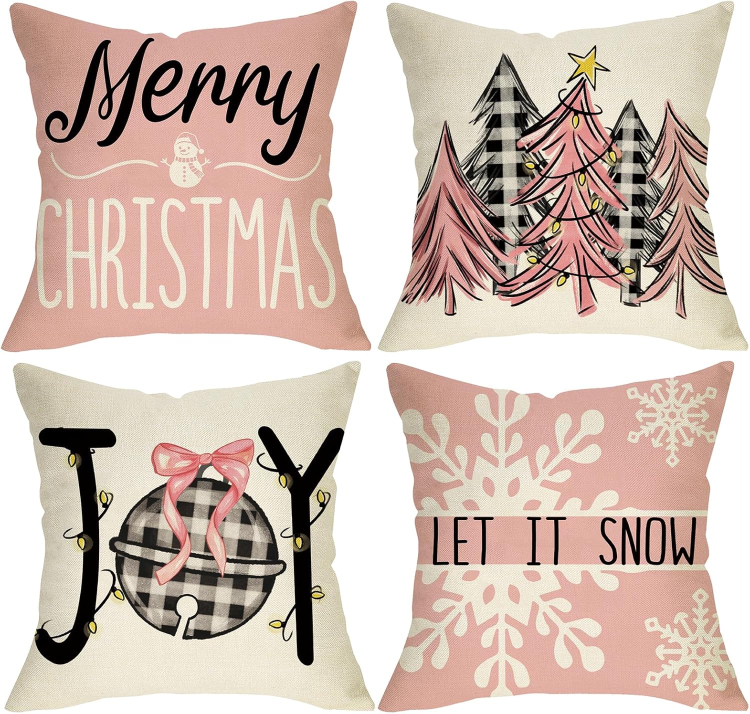 Merry Christmas Pink Decorative Throw Pillow Covers 18 x 18 Set of 4, Xmas Tree Snowflake Joy Bell Buffalo Plaid Porch Outdoor Home Decor, Let It Snow Winter Holiday Sofa Couch Cushion Case