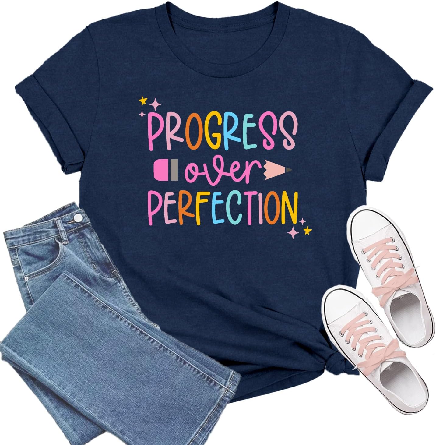 Teacher Shirts for Women Teaching T-Shirt Progress Over Perfection Tee Tops