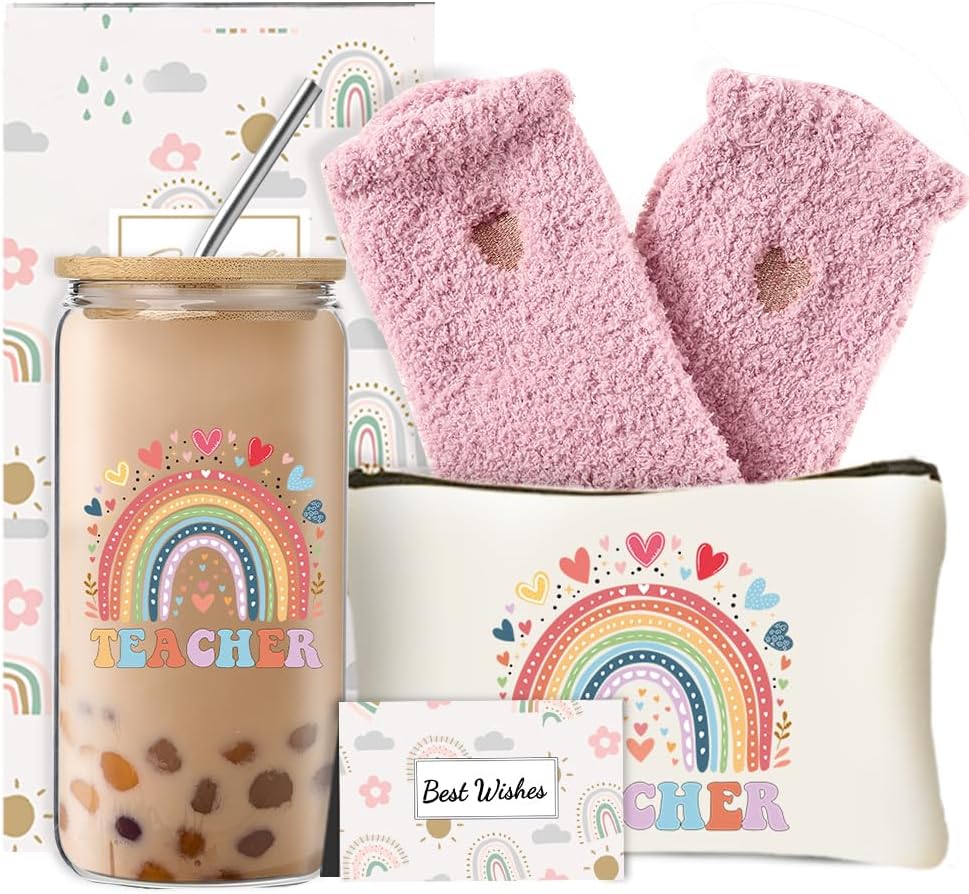 - Teacher Gifts for Women: Our teacher gifts set includes a 16 ounce teacher glass coffee cup, teacher makeup bag, a pair of socks and a greeting card, which you can write down what you want to express,this gift box is very suitable for giving it to your teacher