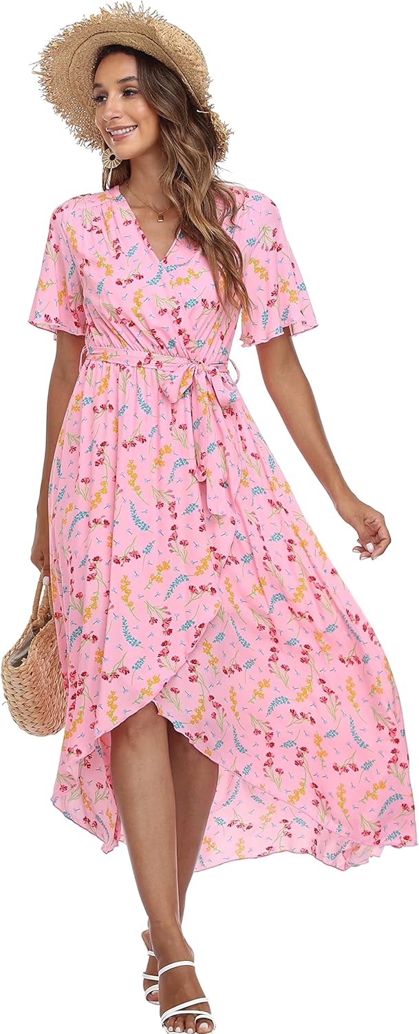 VintageClothing Women's Wrap V Neck Floral Summer Dresses High Low Maxi Casual