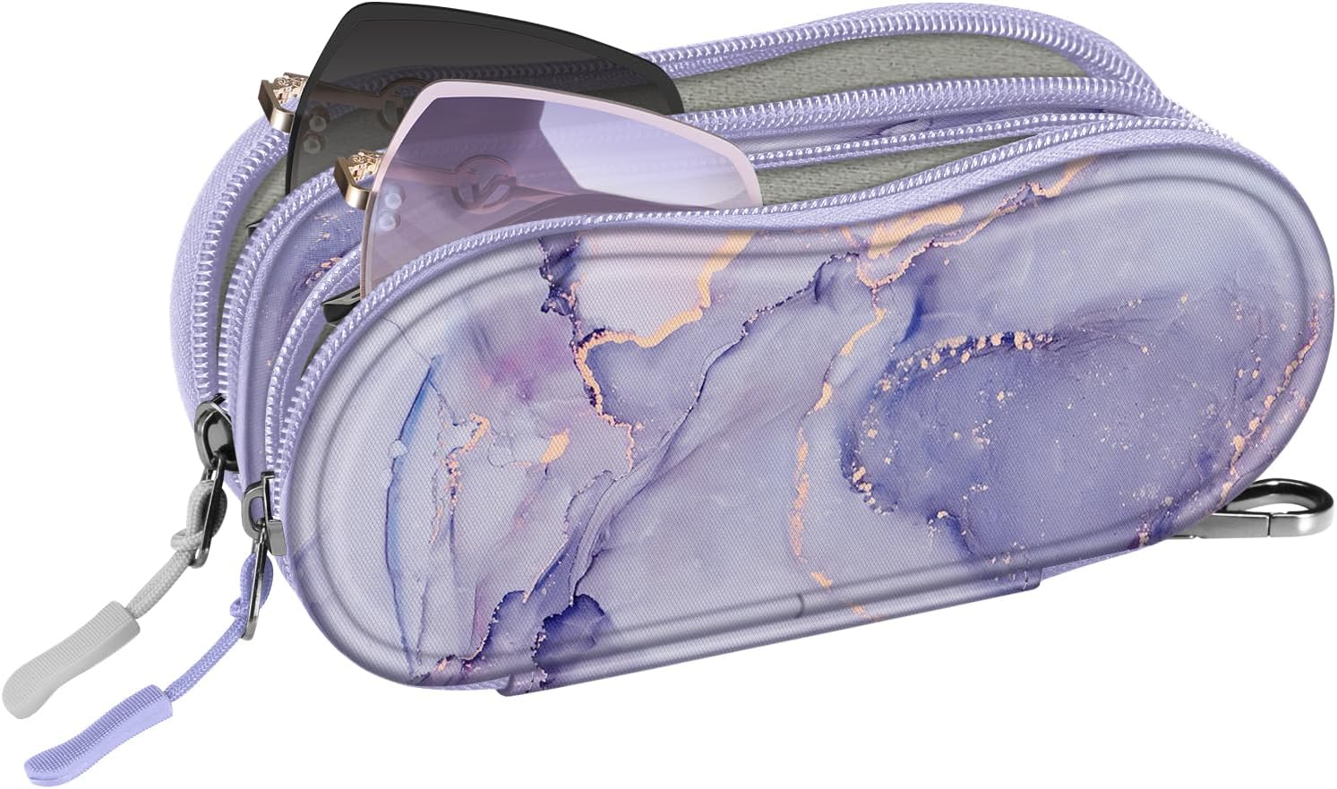FINTIE Double Sunglasses Case, Soft Portable Eyeglasses Pouch with Carabiner Clip, Dual Zipper Compartments for Men Women, Lilac Marble