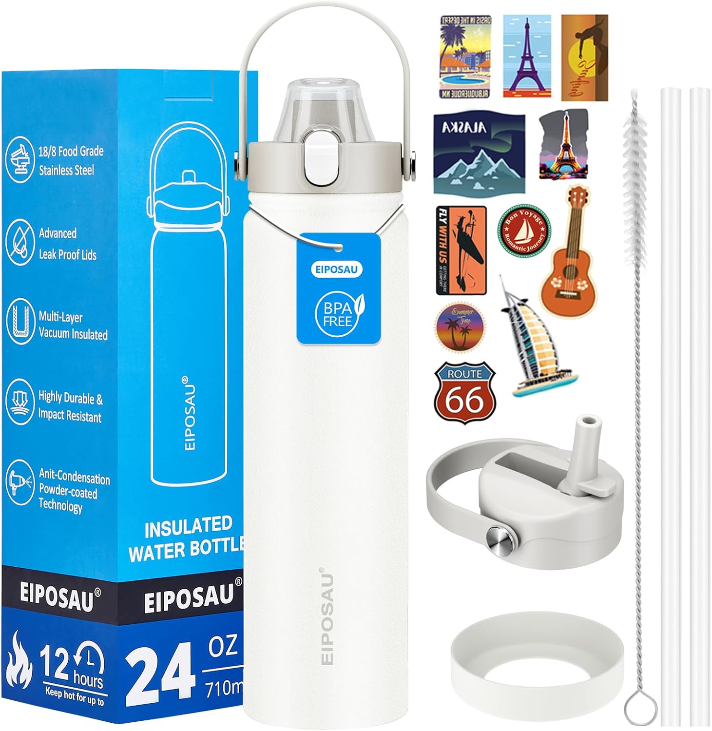 1 x 24oz Insulated Water Bottle, 1 x Silicone Bottle Boot, 1 x Spout Lid, 1 x Straw Lid, 36 x Waterproof Sticker