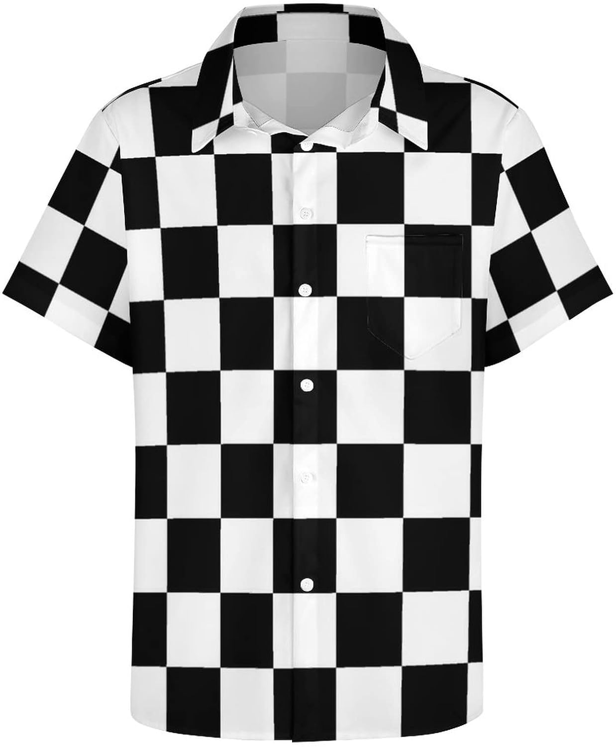Black White Race Checkered Flag Pattern Men's Short Sleeve Casual Loose Button Down Shirt Hawaiian Beach Shirt