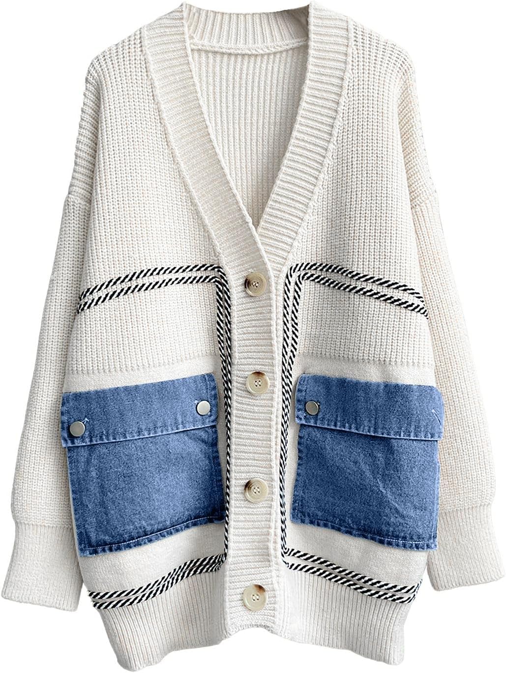 ebossy Women's Spliced Denim Pockets Knit Cardigan Button Down Slouchy Stripe Sweater Outwear