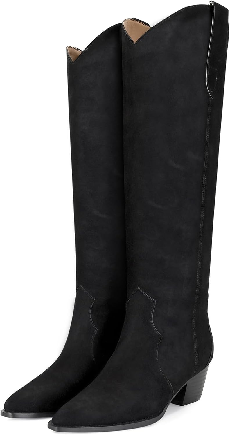 Suede Cowboy Boots for Women Pointed Toe Cowgirl Knee High Boots Chunky Heels Tall Boot Dressy Pull on Wide Calf Fashion Casual