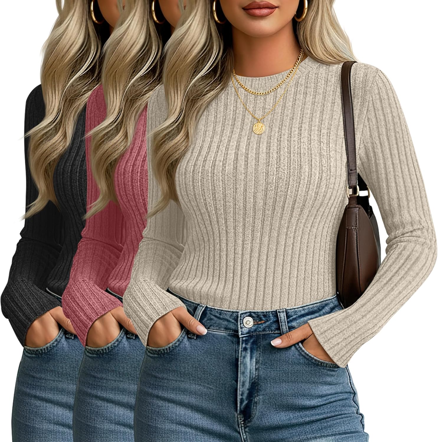 3 Pack Women's Fitted Ribbed Sweaters Tops, Long Sleeve Crew Neck Slim Fit Thermal Fall Winter Base Sweater