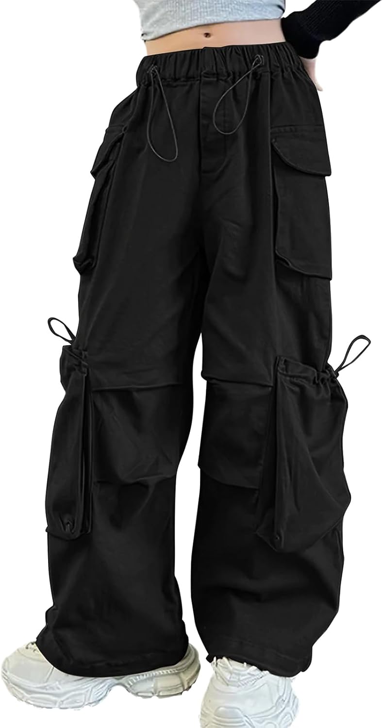 Girls Vintage Multiple Pockets Cargo Pants Wide-Leg Casual Straight Streetwear, 6-14 Years