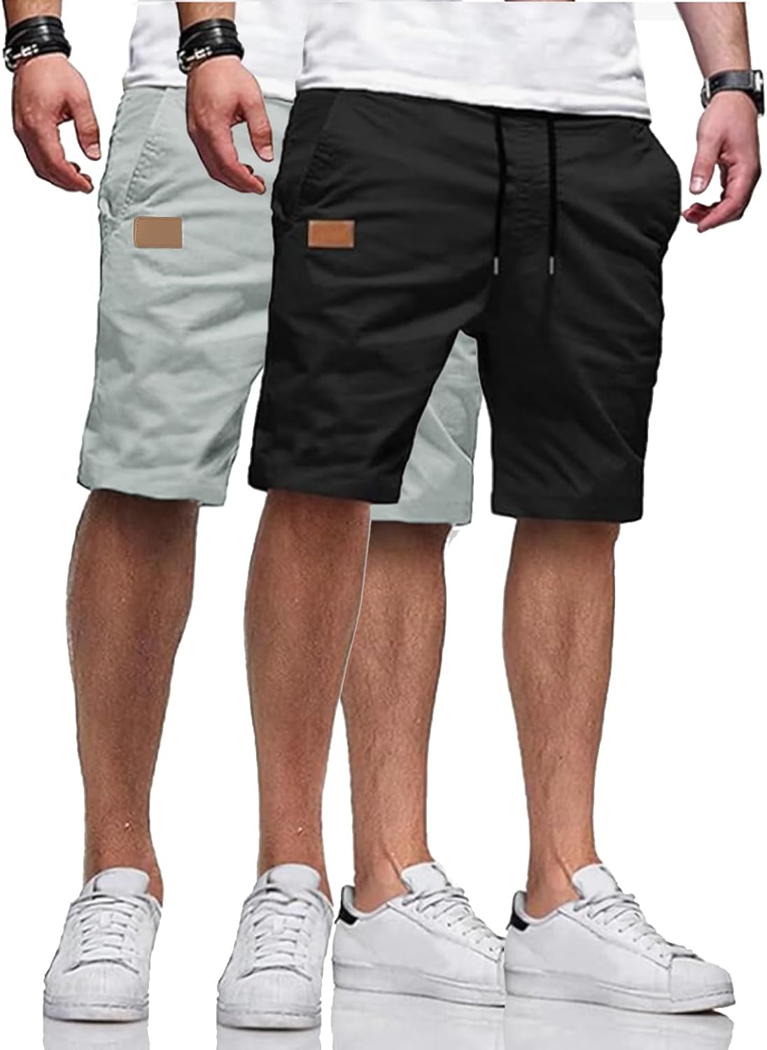 Poplee Men's 2 Pack Casual Twill Chino Shorts Slight Summer Beach Elasticity Cotton Shorts with Elastic Waist Drawstring