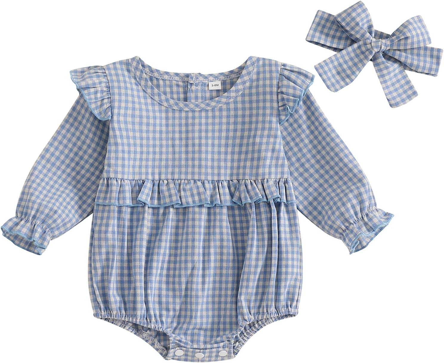 Karuedoo Newborn Baby Girl Clothes Gingham Plaid Bubble Romper Long Sleeve Ruffle Bodysuit with Headband Spring Fall Outfit