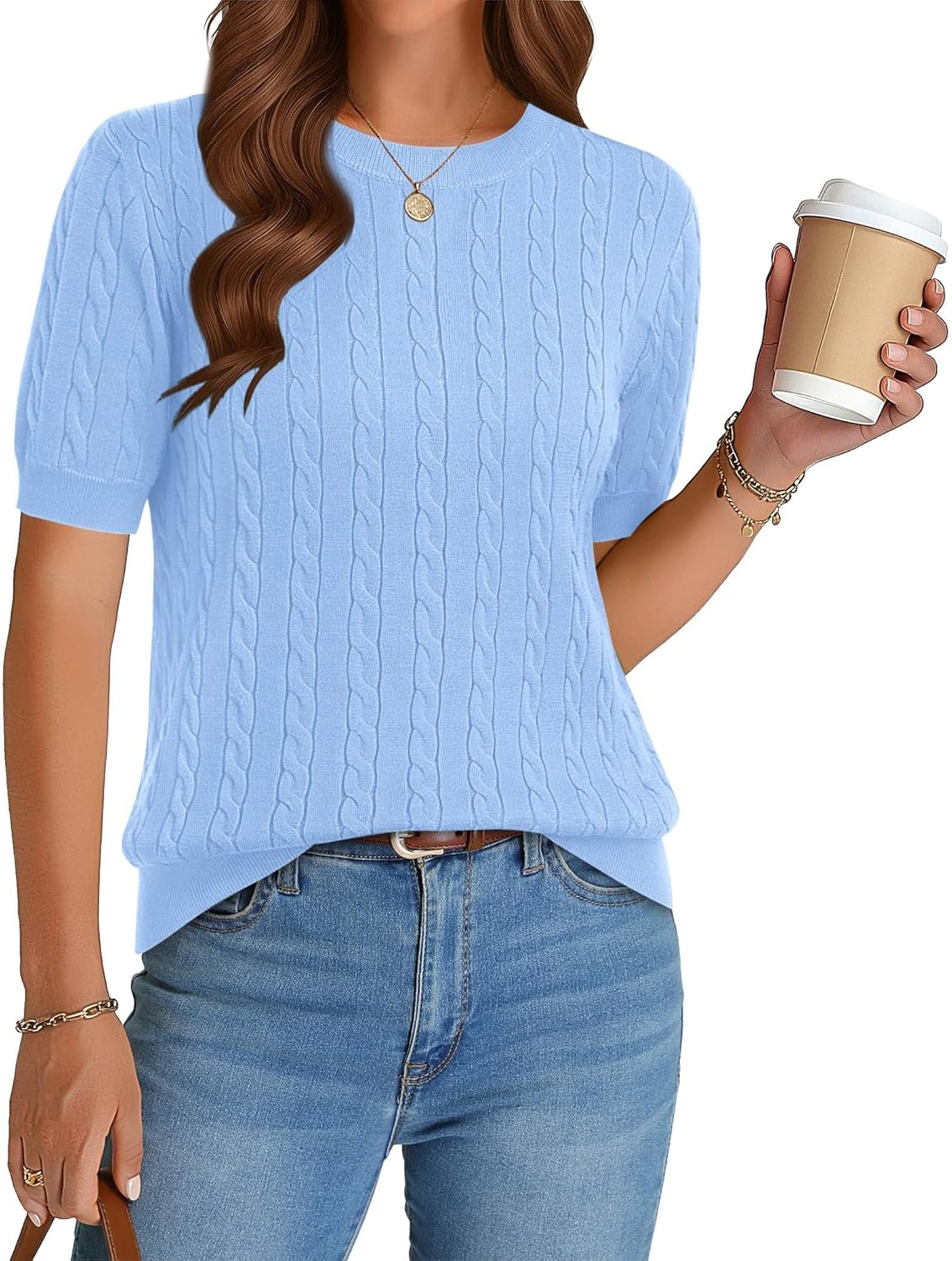 Zeagoo Cable Short Sleeve Sweaters for Women Summer Spring Cute Tops 2026 Trendy Business Causal Outfits Work Blouses Clothes