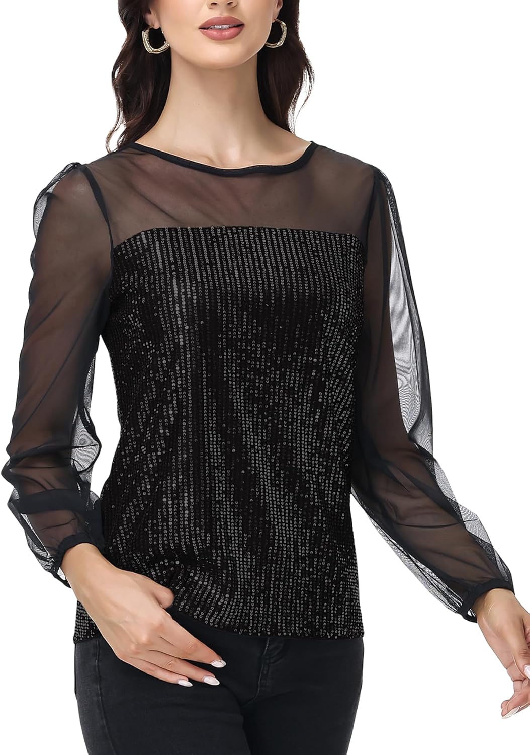 Anna-Kaci Women's Long Sleeve Sequin Blouse Sheer Mesh Top Sparkly Shirt for Holiday Party
