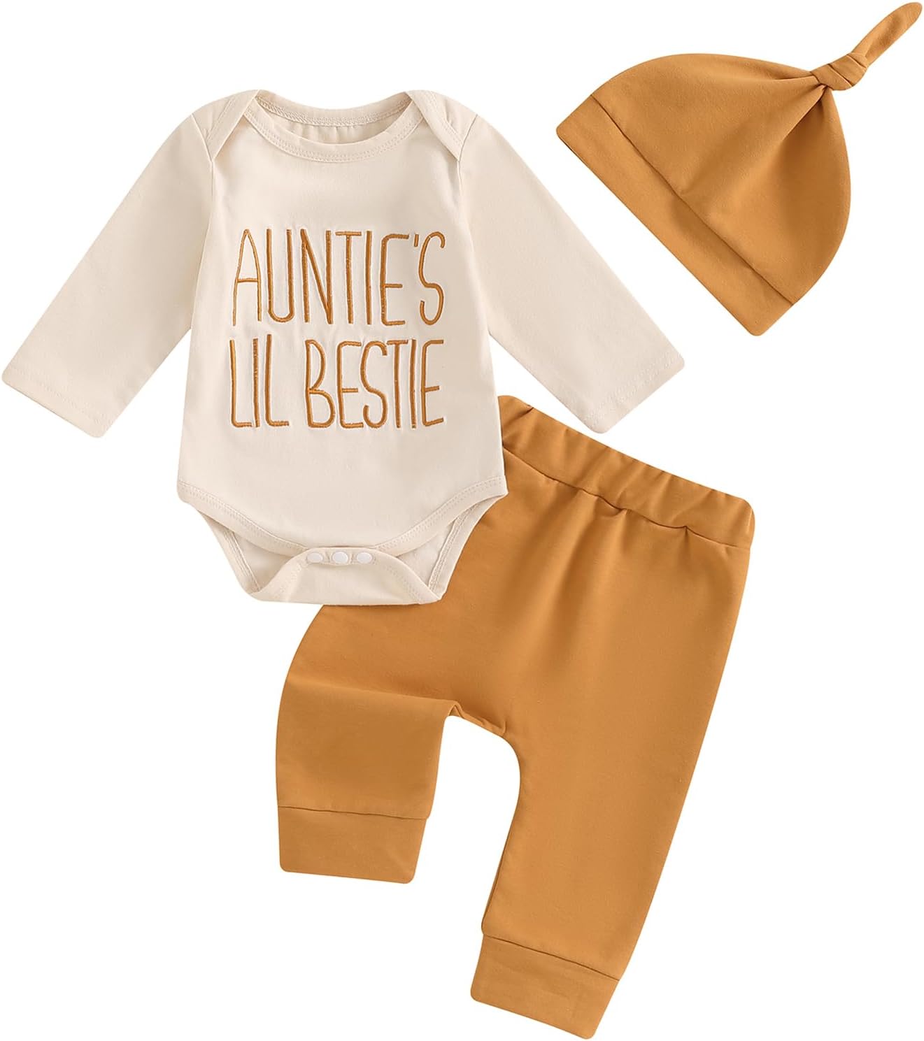 SAYOO Aunties Bestie Baby Clothes Gender Neutral Unisex Funny Letter Bodysuit Romper Solid Leggings Pants Hat 3Pcs Outfits