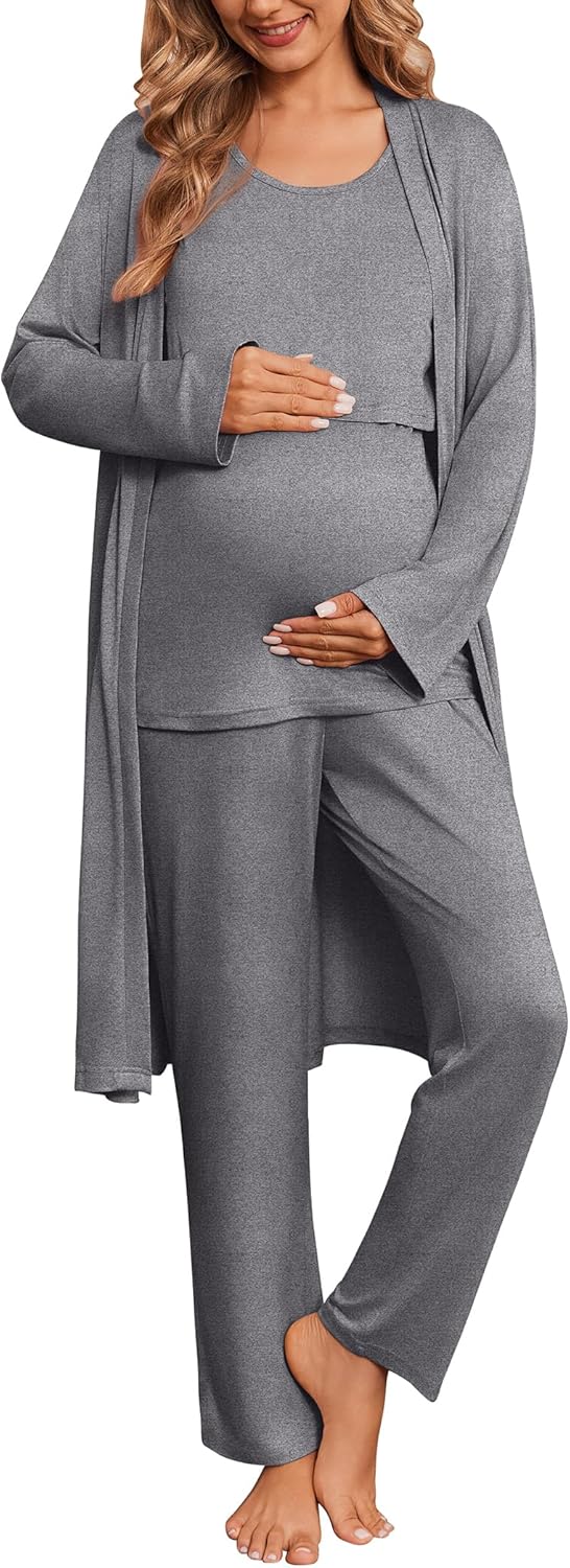 Ekouaer Nursing Pajamas Maternity Robe Set 3 Pieces Postpartum Maternity Pajama Set Pregnancy Breastfeeding Pj