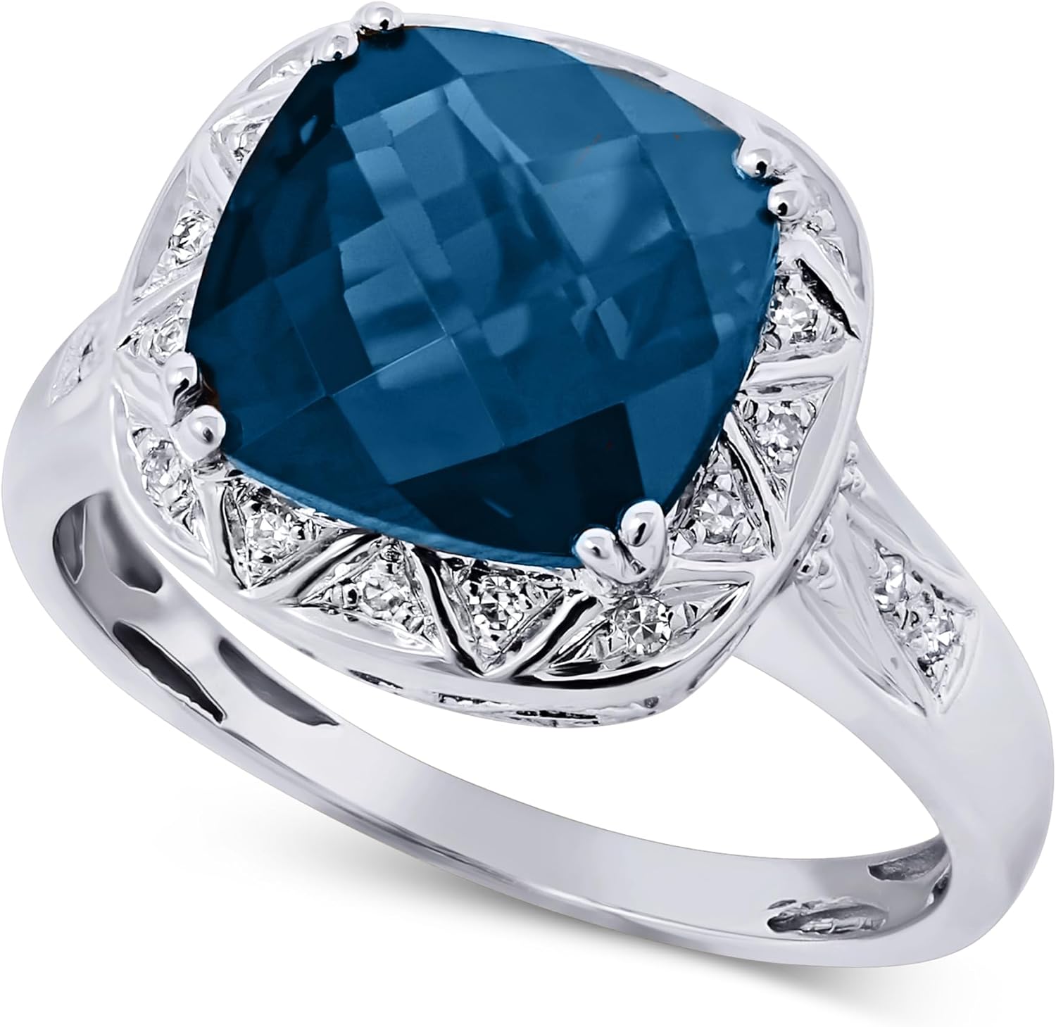 925 Sterling Silver Genuine London Blue Topaz 9mm Cushion, Diamond Ring. Size 7