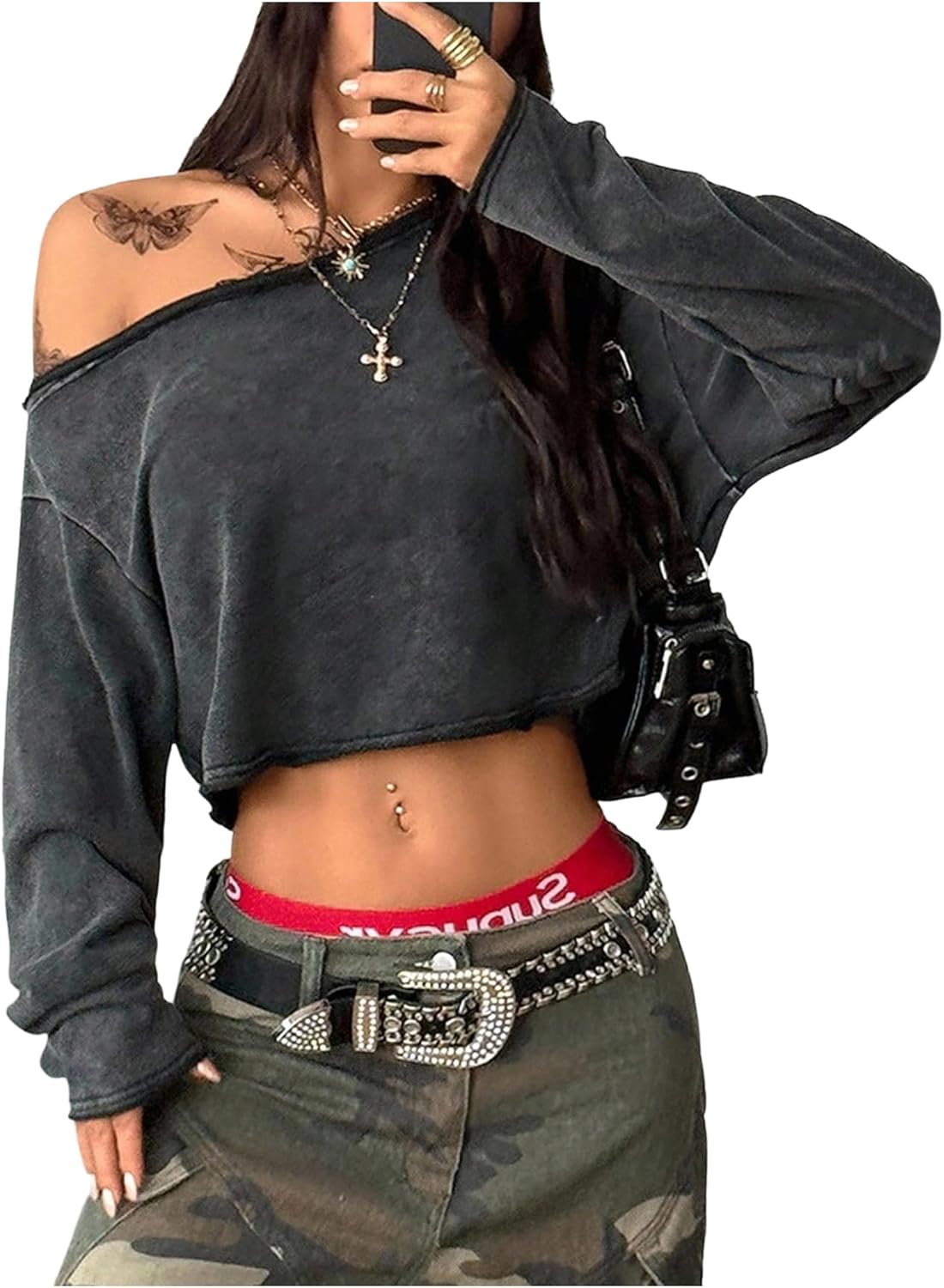 SweatyRocks Women's Off The Shoulder Long Sleeve Crop Tops Y2k Loose Fit Grunge T Shirts Streetwear