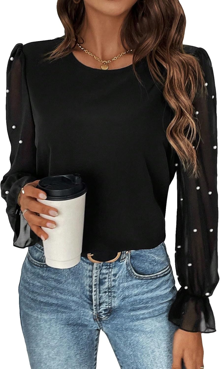 SOLY HUX Women's Mesh Long Sleeve Tops Pearls Beaded Elegant Business Casual Blouse Shirts