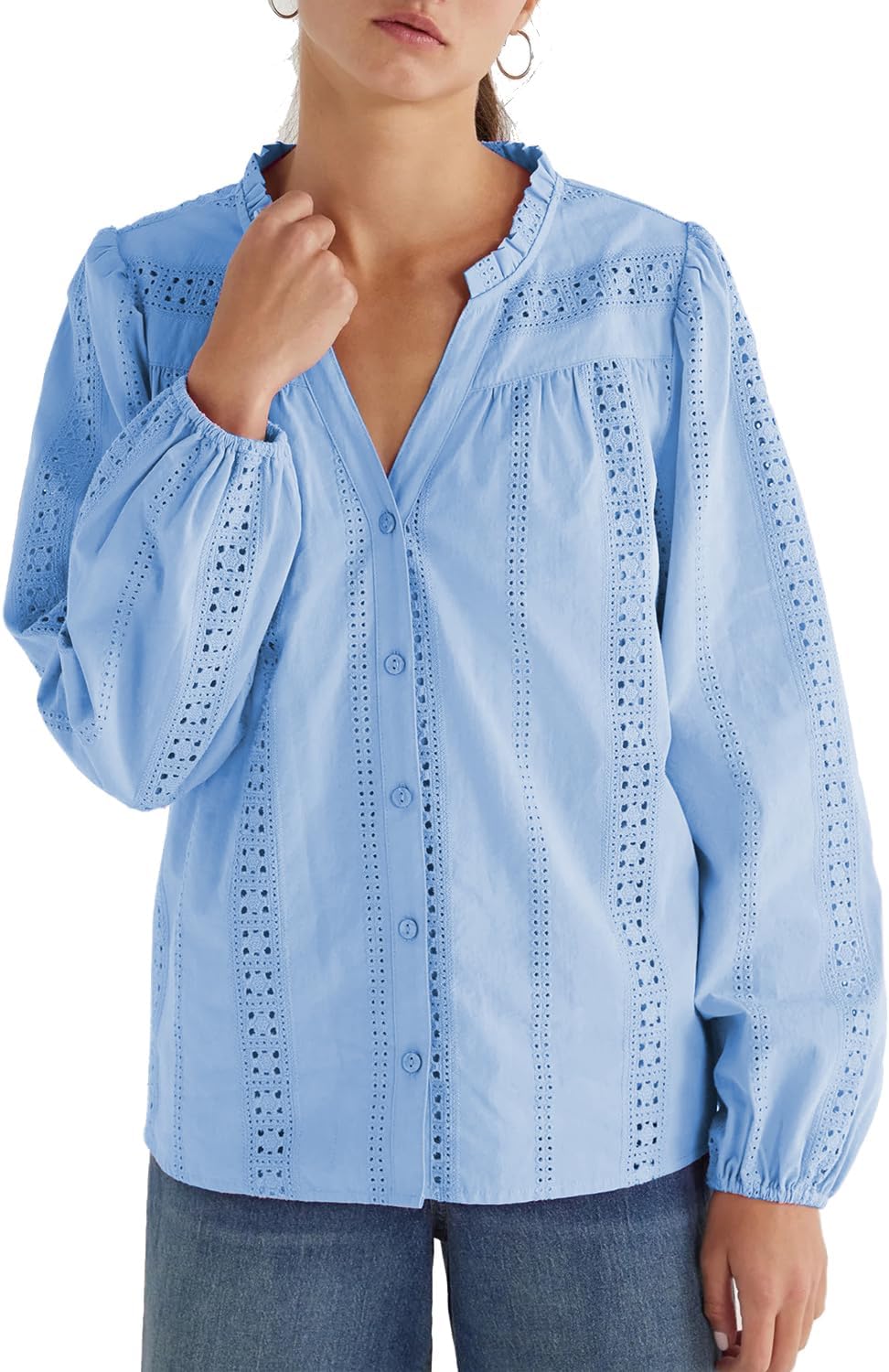 OWNGIGI Women Blouses Button-Down Shirt with Crochet Trim Long Sleeve Bohemian Blouse Dressy Casual Work Tops for Women