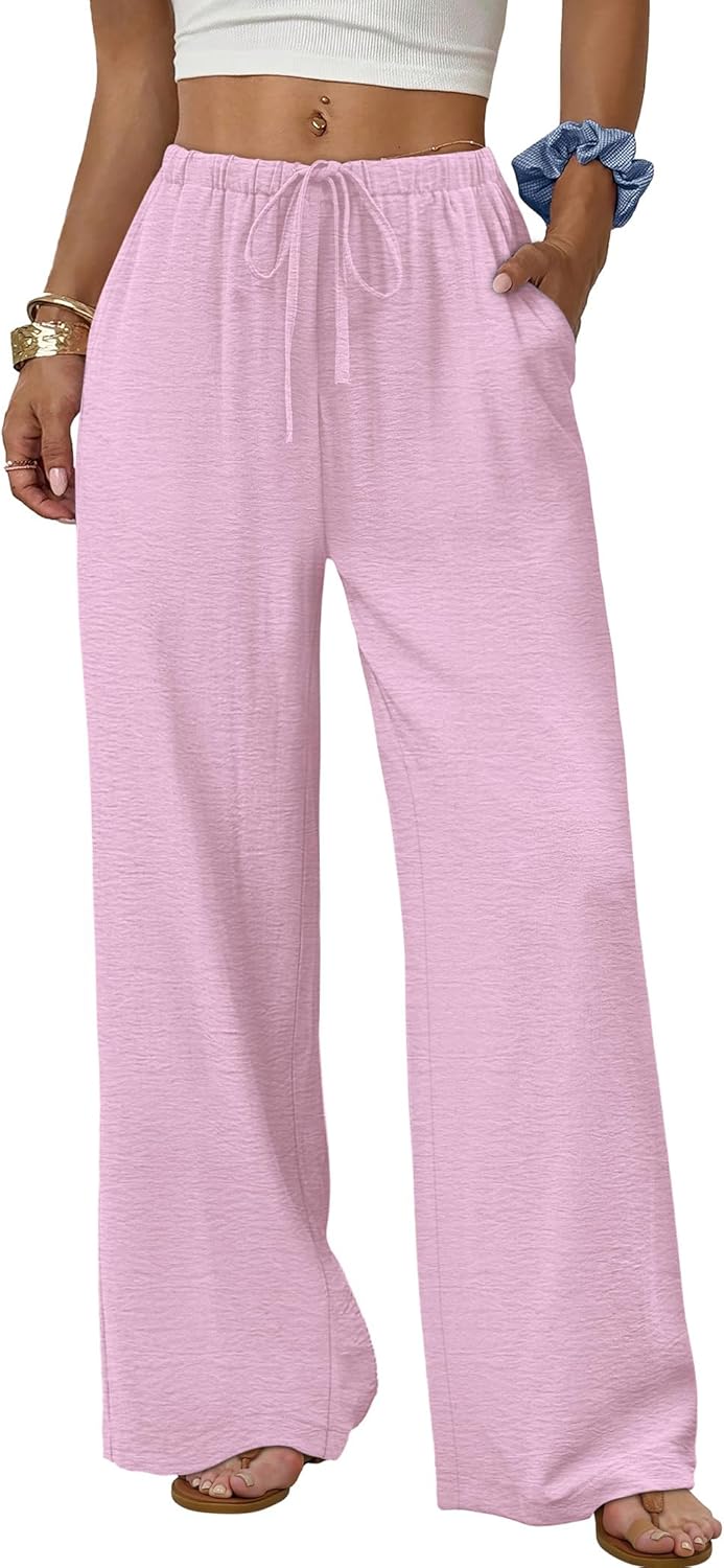 Sampeel Women's Linen Summer Palazzo Pants Flowy Wide Leg Beach Trousers with Pockets Pink
