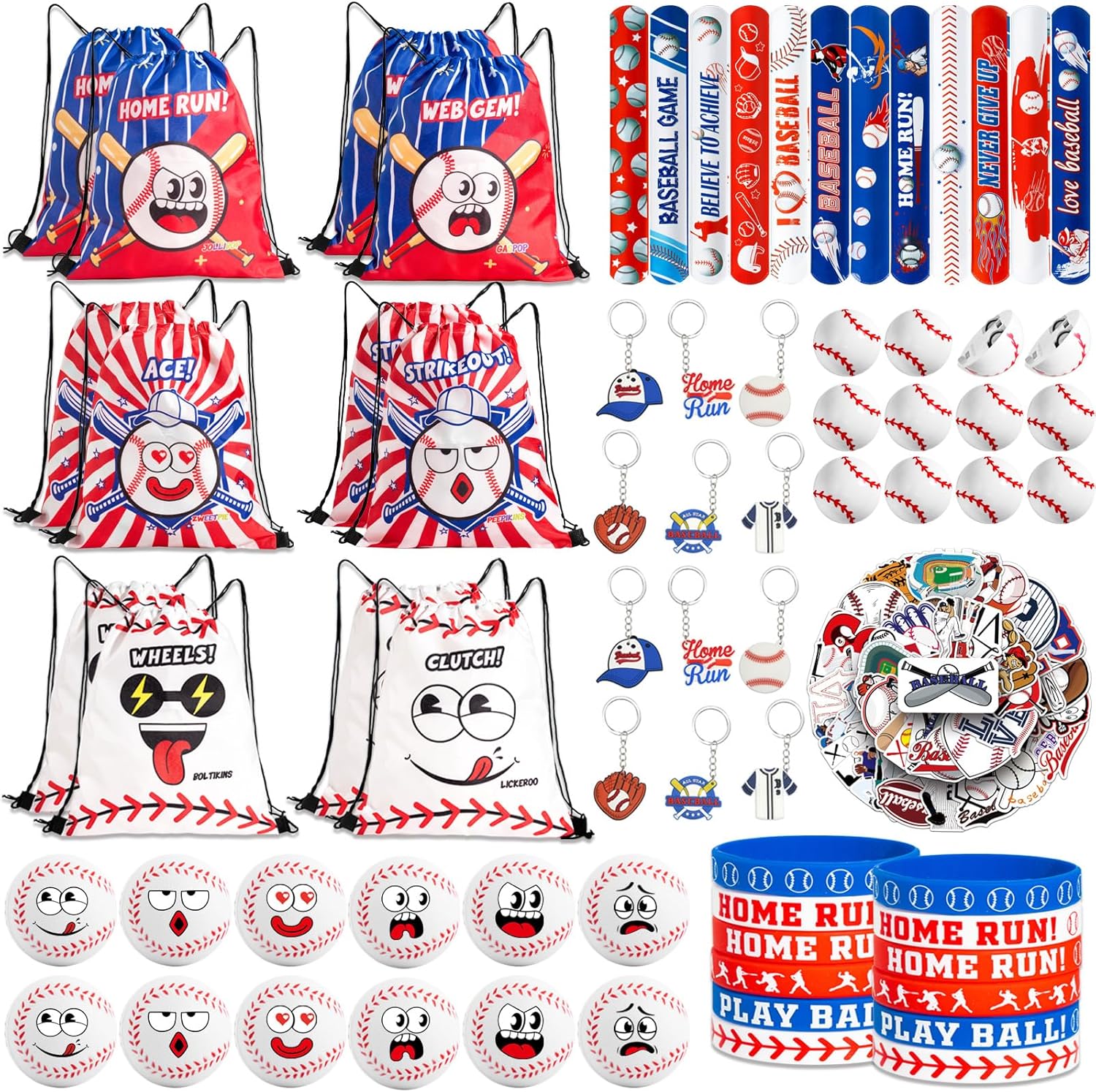 122 Pcs Baseball Party Favors for Kids - Themed Goodie Bag Set with 12 Funny Face Drawstring Bags & Stress Balls, Pull Back Cars, Wristbands, Slap Bracelets, Keychains, Stickers for Party Supplies