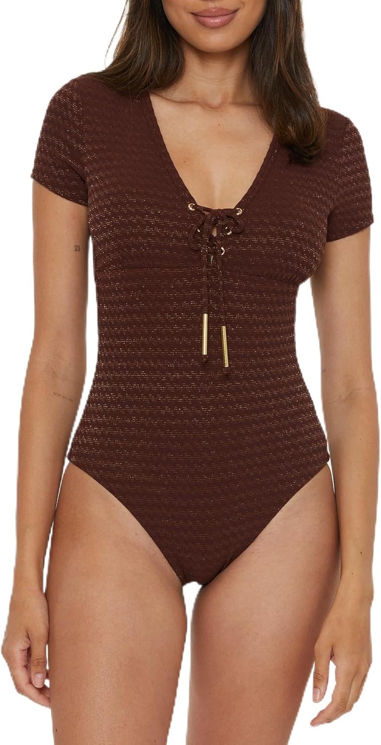 Trina Turk Women's Glimmer Lace Up One Piece Swimsuit, Plunge V-Neck, Bathing Suits