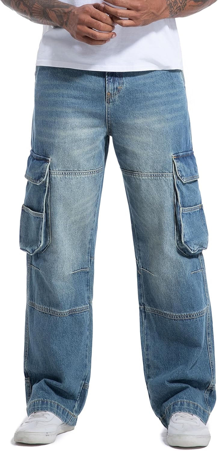 Men's Non-Stretch Loose Fit Wide-Leg Baggy Cargo Jeans Pants