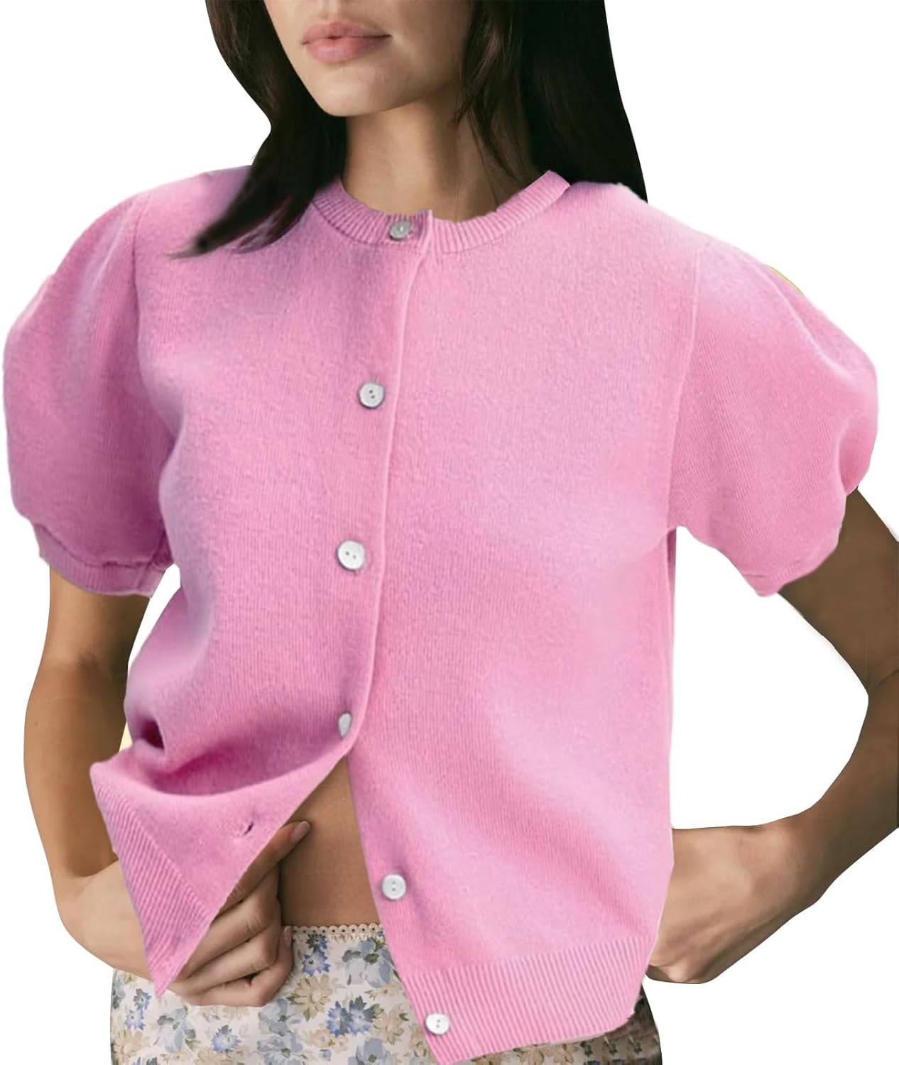 Womens Lightweight Puff Short Sleeve Cardigan Sweater Summer Y2k Cropped Knit Button Up Blouse Tops