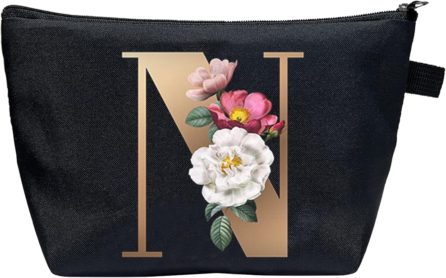 CTNUOBEE Small Letter Comestic Bag Gold Alphabet with Flower Makeup Bag Portable Travel Stuff Bag Zipper Bag Initial Toiletry Pouch Personalized Gifts for Women (N)