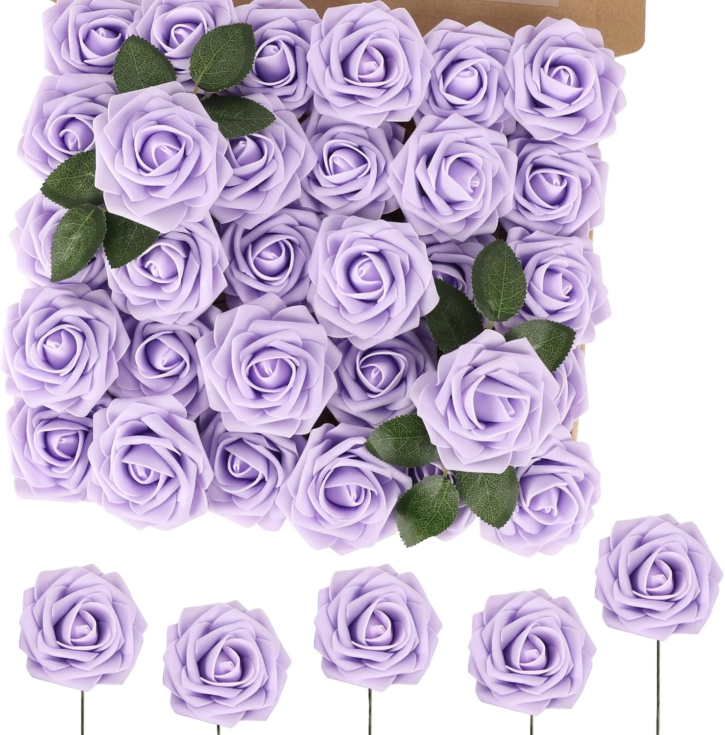 MACTING 60PCS Artificial Rose Flowers Real Touch Lavender Flowers with Stem Fake Foam Roses for DIY Wedding Bouquet Table Centerpieces Party Baby Shower Home Spring Mothers Day Decorations