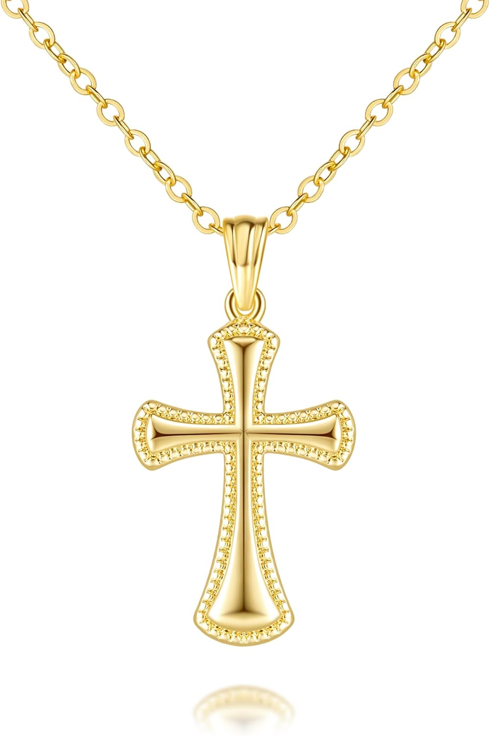Gold Cross Necklaces for Women 14K Gold Cross Necklace for Women Pendant Necklace Womens Fine Dotted Border and Raised Surface Dainty Cross Chain for Womens Faith (16.5''+3.2'')