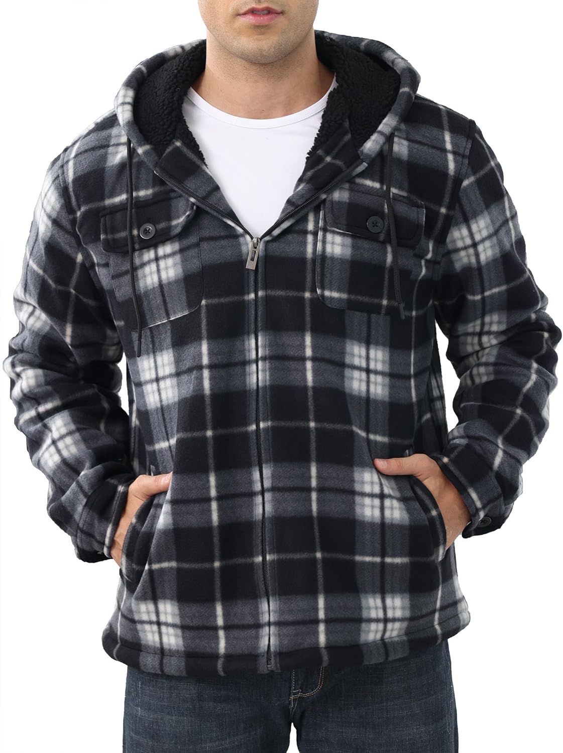 Men's Flannel Shirt Jacket Fleece Sherpa Lined Plaid Jackets Warm Thick Coat Full Zip Up Hoodie Winter Outwear