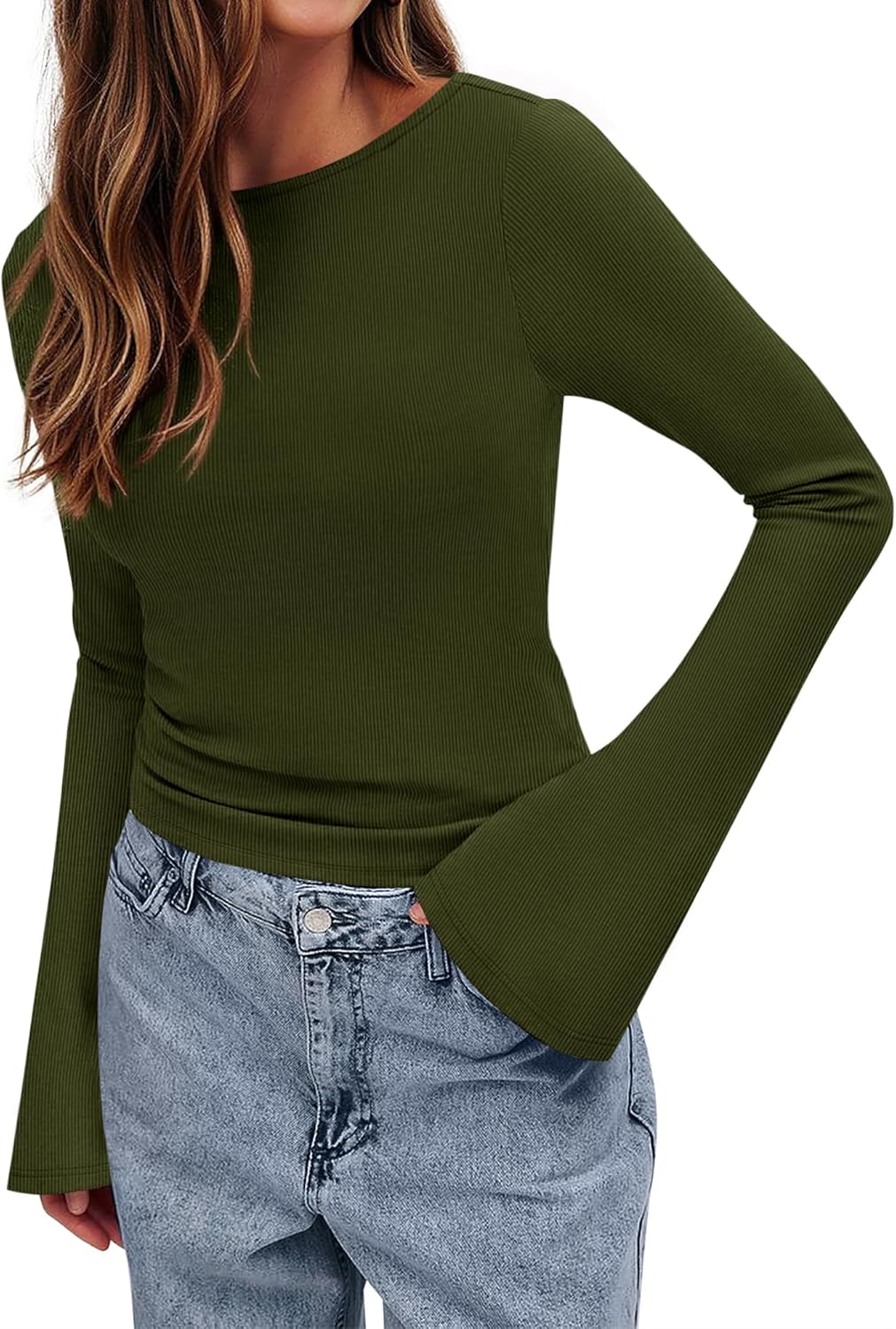 BTFBM Long Sleeve Shirts for Women 2026 Spring Y2K Clothes Casual Boat Neck Bell Sleeve Fitted Fall Going Out Tops