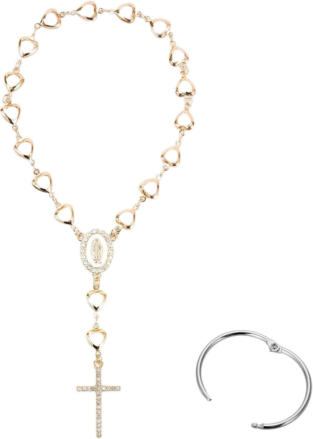 Car Rosary for Rearview Mirror, Evil Eye Auto Rosary Beads, Car Medal and Hanging Accessories for Interior Decors for Women Men (heart- Golden)