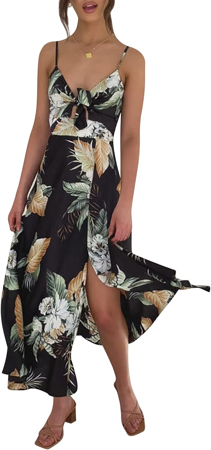 Fashionme Women Spaghetti Strap Midi Satin Dresses Tie Front Backless Slit Cutout Dress Semi-Formal/Casual Flowy Lightweight