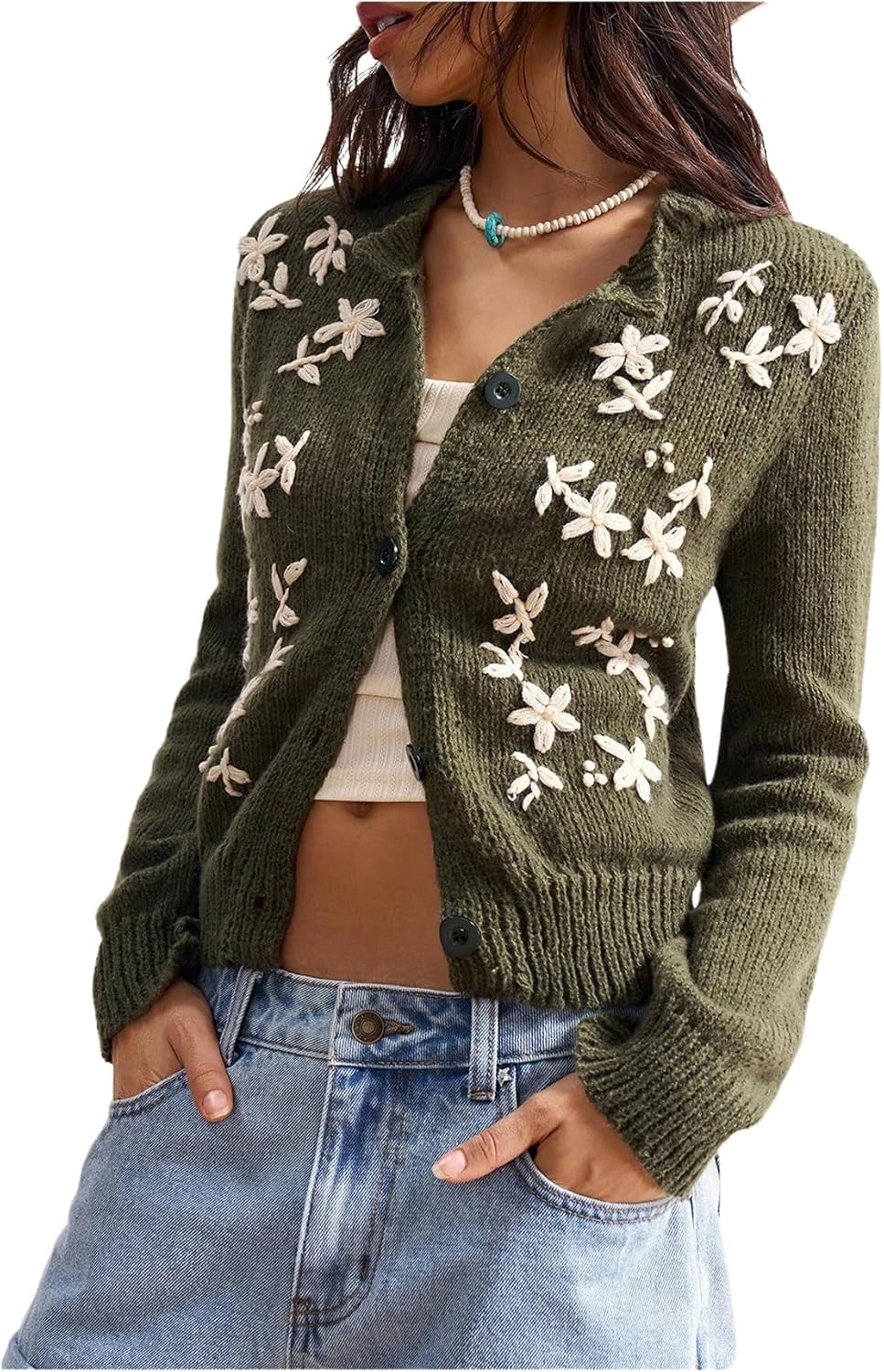 SHENHE Women's Knitted Cardigan Crewneck Button Down Flower Embroidered Soft Cardigan Sweater