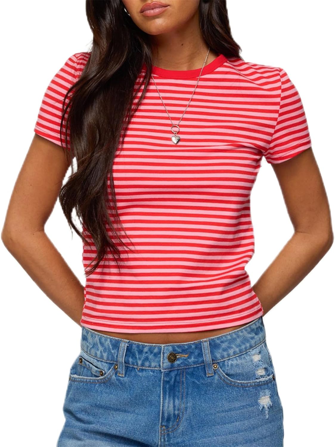 Women Y2k Striped Baby Tees Basic Cute Short Sleeve Crew Neck Slim Fit Crop Top T Shirt Vintage Going Out Streetwear
