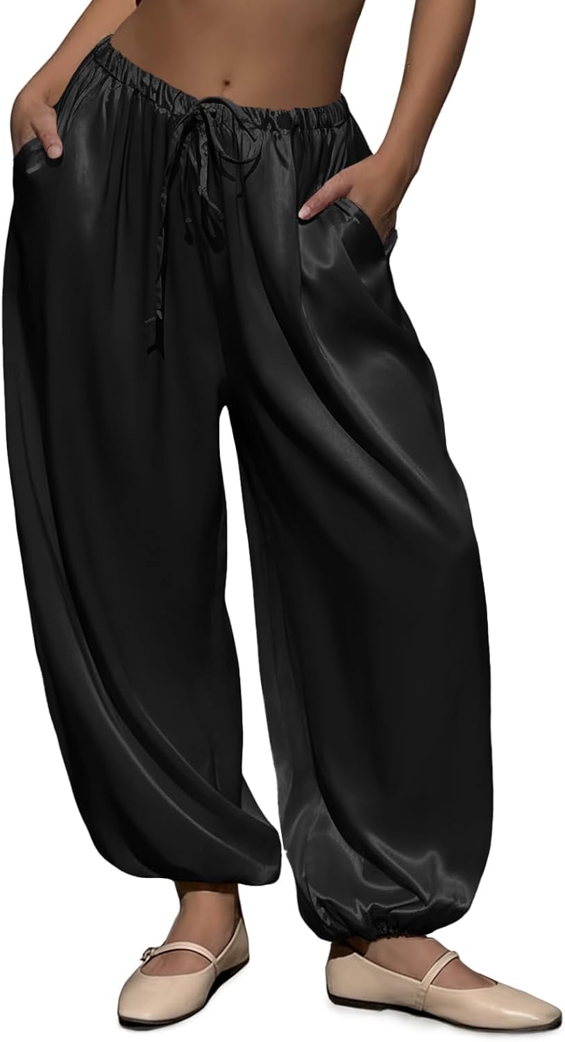 Fisoew Womens Satin Harem Pants Casual Baggy Barrel Leg Elastic Waist Drawstring Loose Workout Track Pants with Pockets