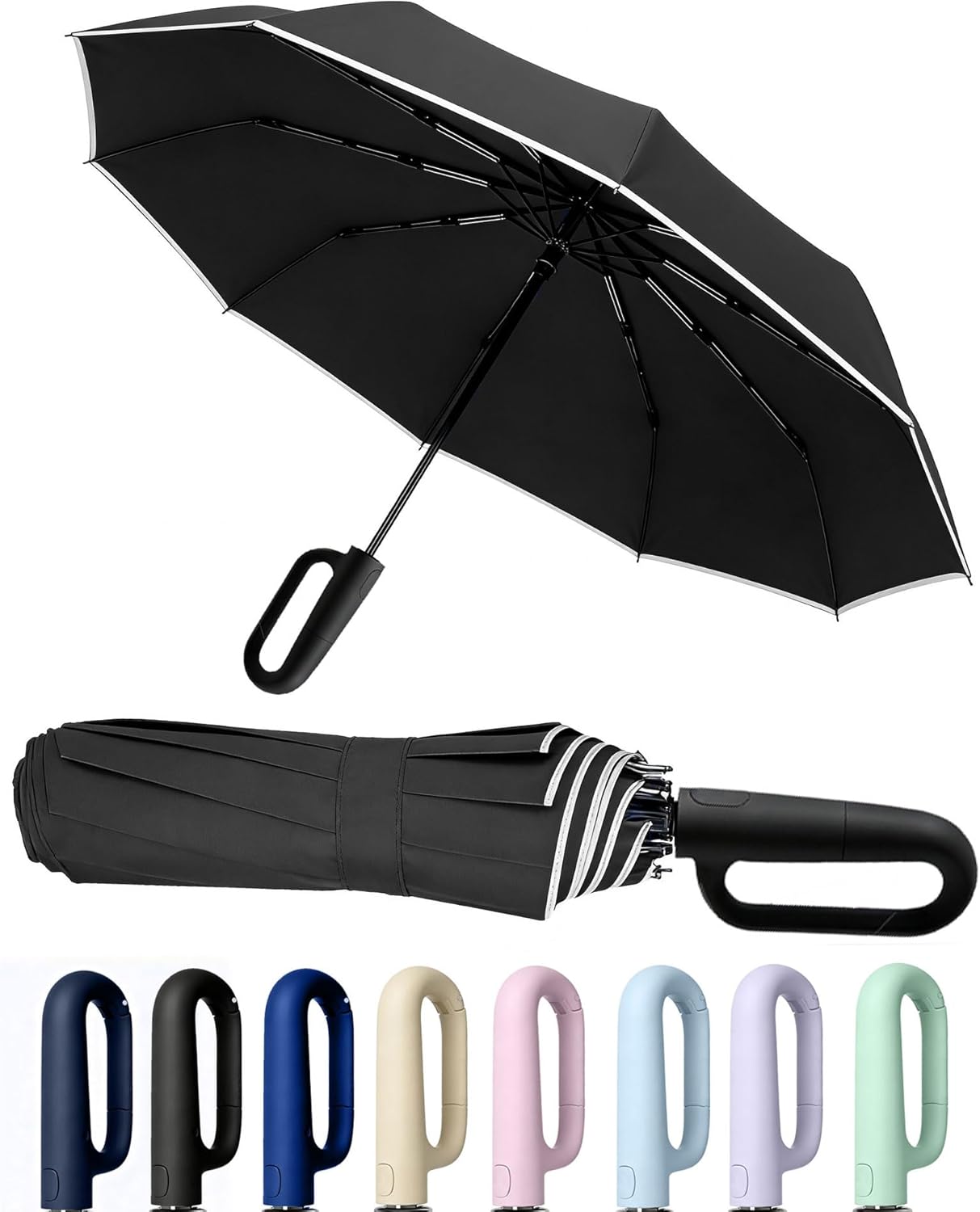 SIEPASA Travel Umbrella with Carabiner Handle - Windproof 10 Ribs Auto Open/Close for Rain & Sun Protection, Compact Portable Clip-on Backpack Design with Safety Reflective Strip.