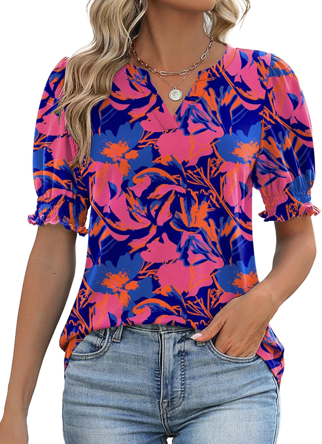Rapbin Women's Puff Short Sleeve T Shirts V Neck Summer Tops Casual Fashion Blouses