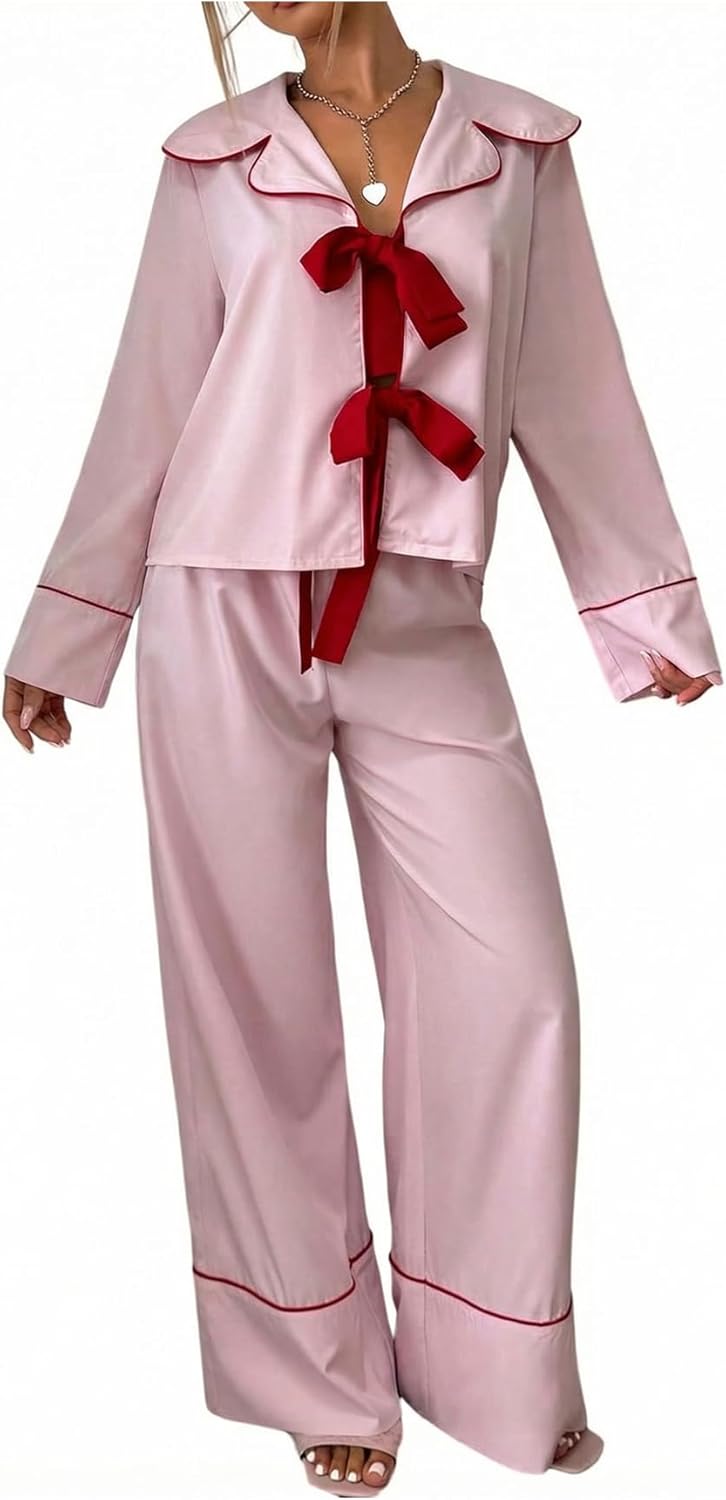 Nsdoiouw Women 2Pcs Valentine's Day Pajamas Set Long Sleeve Bow Tie Shirts Pants Silk Satin Pjs Loungewear Sleepwear Sets