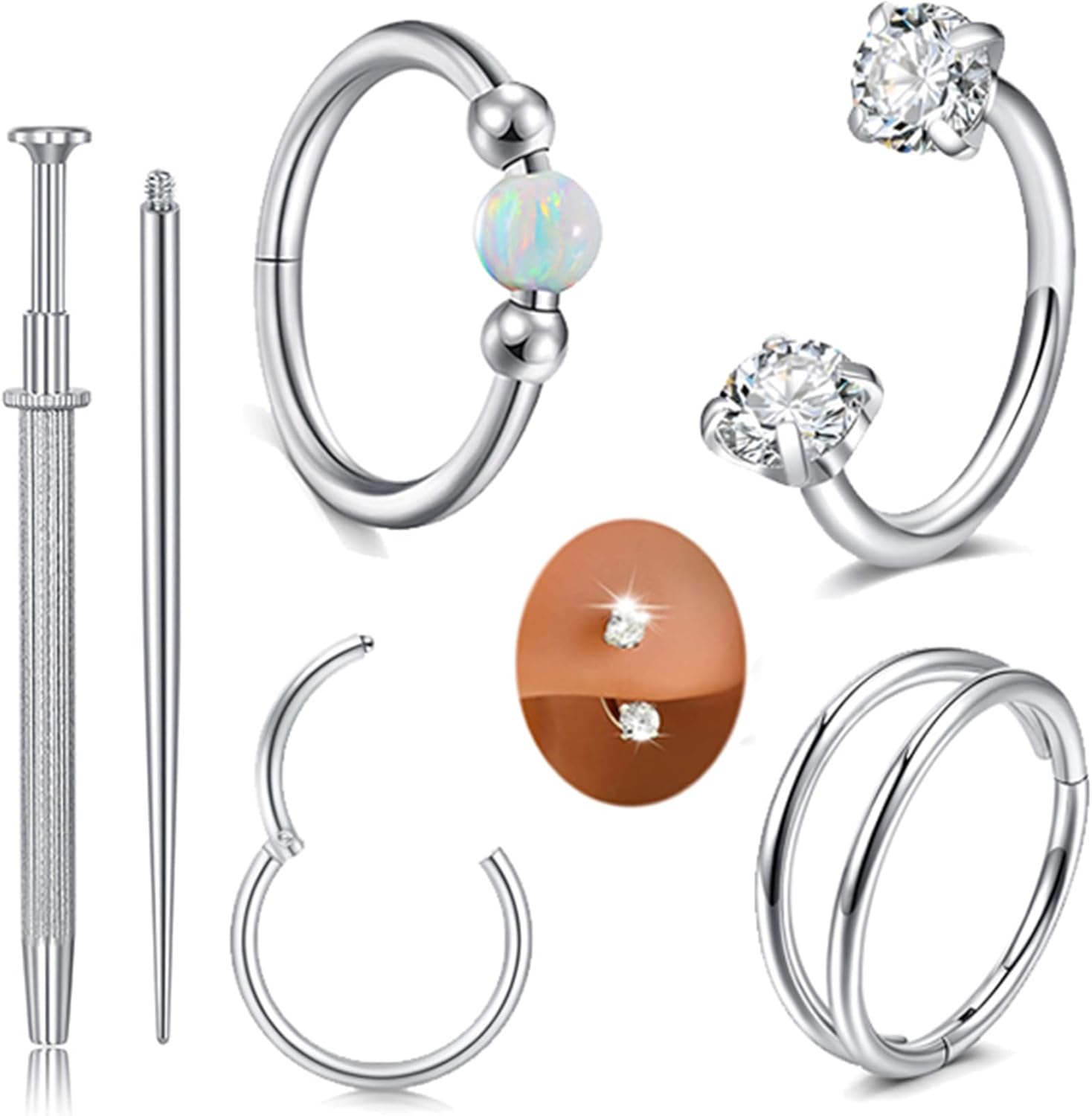 MODRSA 4pcs Silver Cartilage Earrings for Women Helix Piercing Jewelry Opal Double Hoop Earring Clicker Tragus Cartilage Hoop Second Hole Earrings for Women Septum Ring 18g Horseshoe Nose Ring 8mm