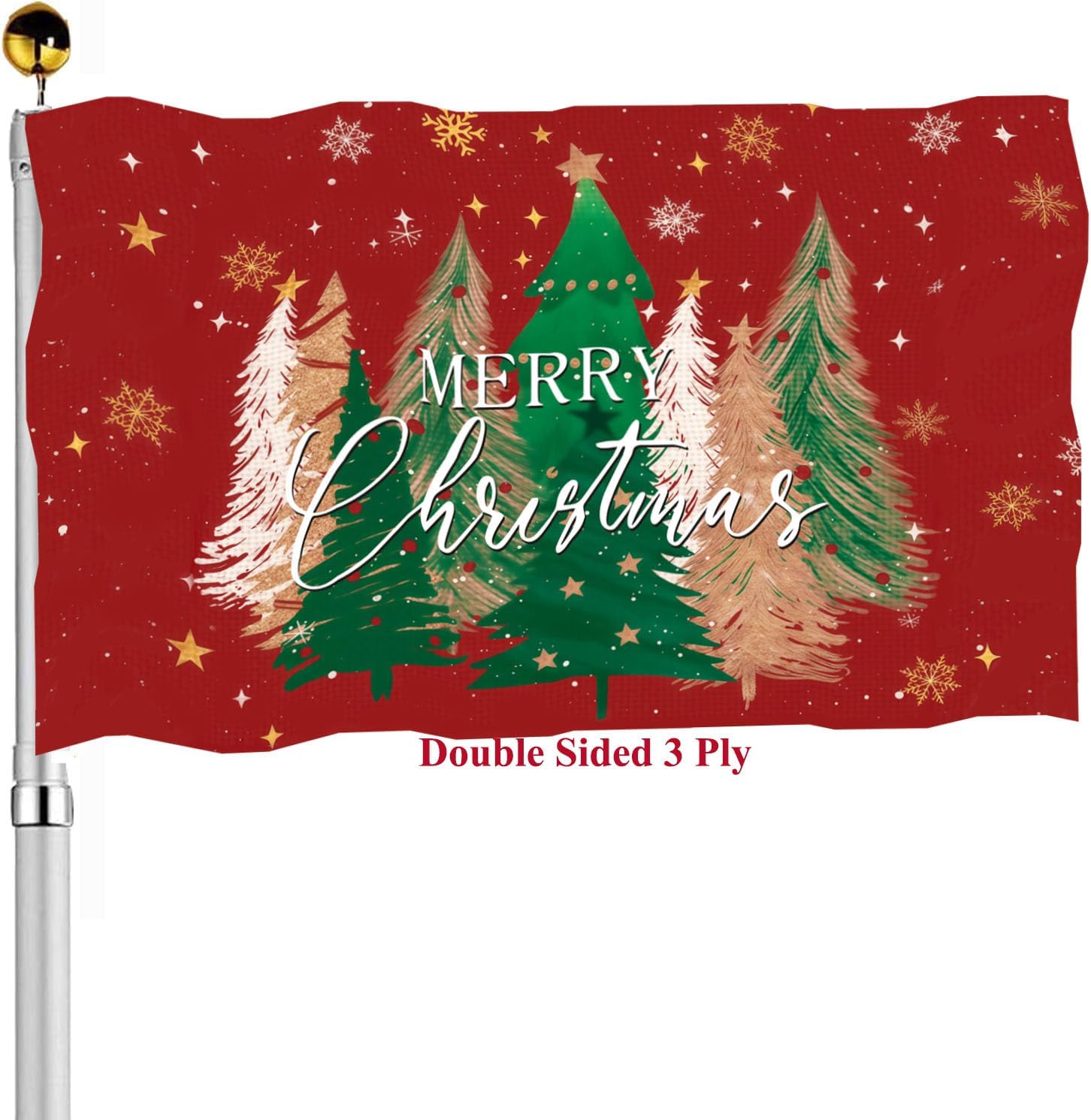 - [PREMIUM CRAFTS]- Merry Christmas tree flag 3x5 for has 2 thicken brass grommets up and down,4 rows stitching for flying end with canvas header,double stitches all around the flag's edge