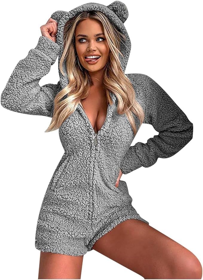 Cdiecer Onesies Pajamas Sherpa Fleece Plush Shorts Jumpsuits Womens Hooded Fuzzy Romper Zipper Bear Sleepwear Playsuits