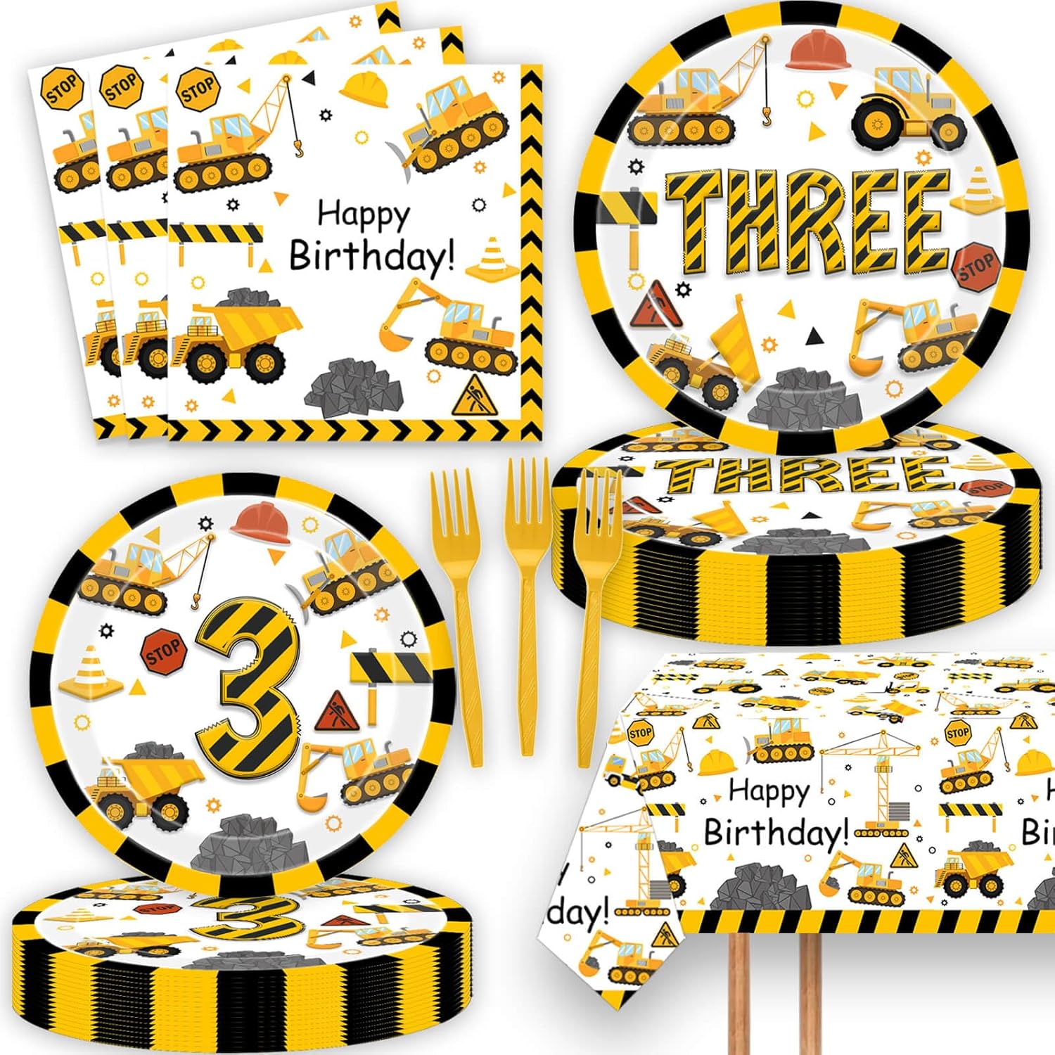 - Package Contents: 1pc 86.8" x 51.2" construction table cloth, 10pcs 7 inch paper plates, 10pcs 9 inch paper plates, 20pcs 6.5inch napkins, 10pcs 6.3inch forks
