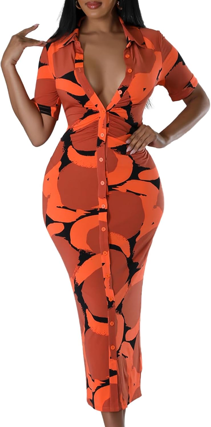 ZERMOM Women's Button Down Shirt Dress Short Sleeve Print Collar V Neck Summer Bodycon Midi Dresses