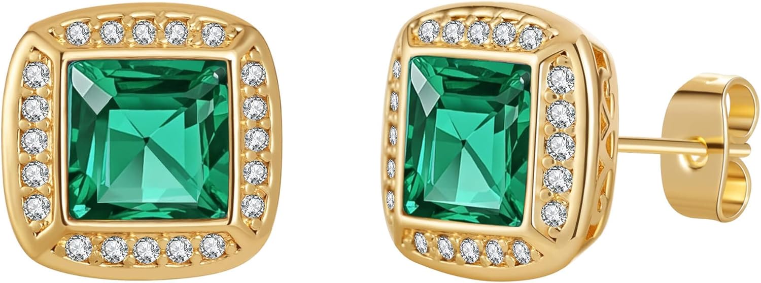 EVEVIC Austrian Crystal Square Stud Earrings for Women 14K Gold Plated Halo Birthstone Earring Jewelry Gifts