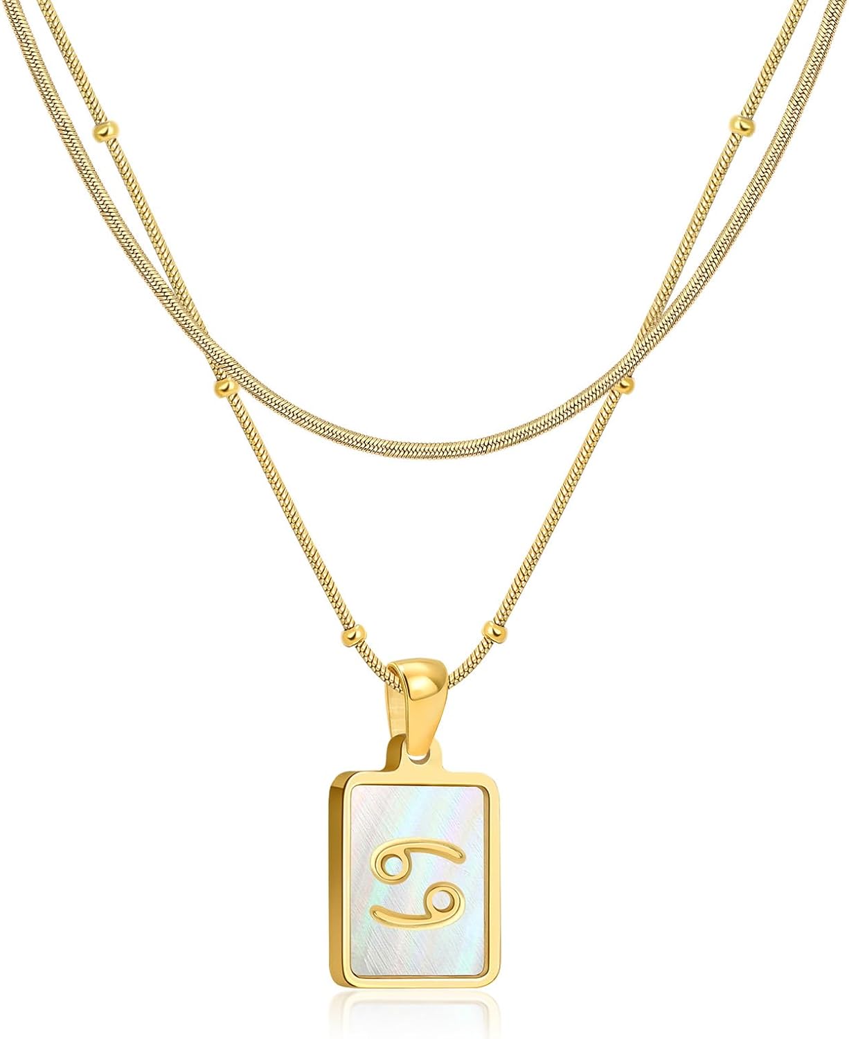 LETFLY Zodiac Natural Shell Layered Gold Necklace for Women, 18K Gold Plated Square Shaped Pendant with Adjustable Layered Snake Chain for Womens Jewelry Gifts