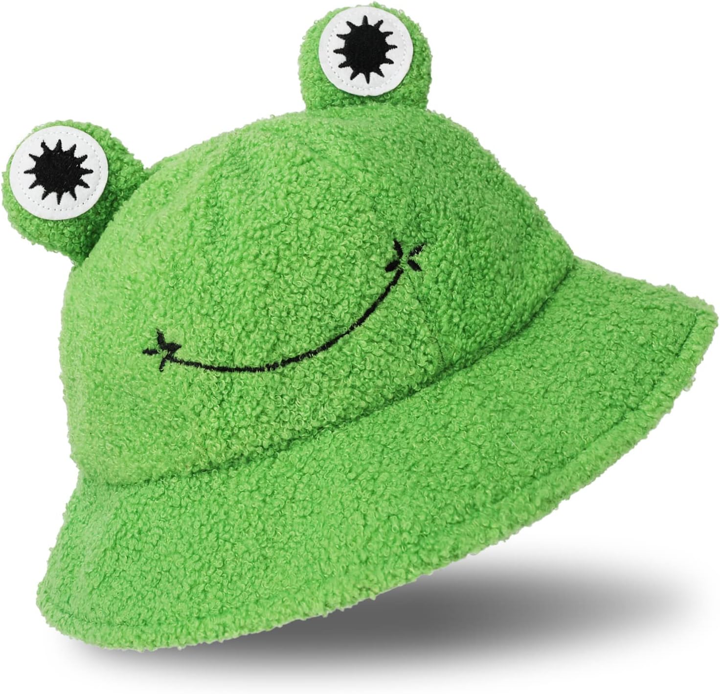 Whaline Plush Frog Hat Cute Winter Green Packable Bucket Hat Keep Warm Funny Animal Fisherman Cap for Christmas Adults Women Men Outdoor Indoor Activities