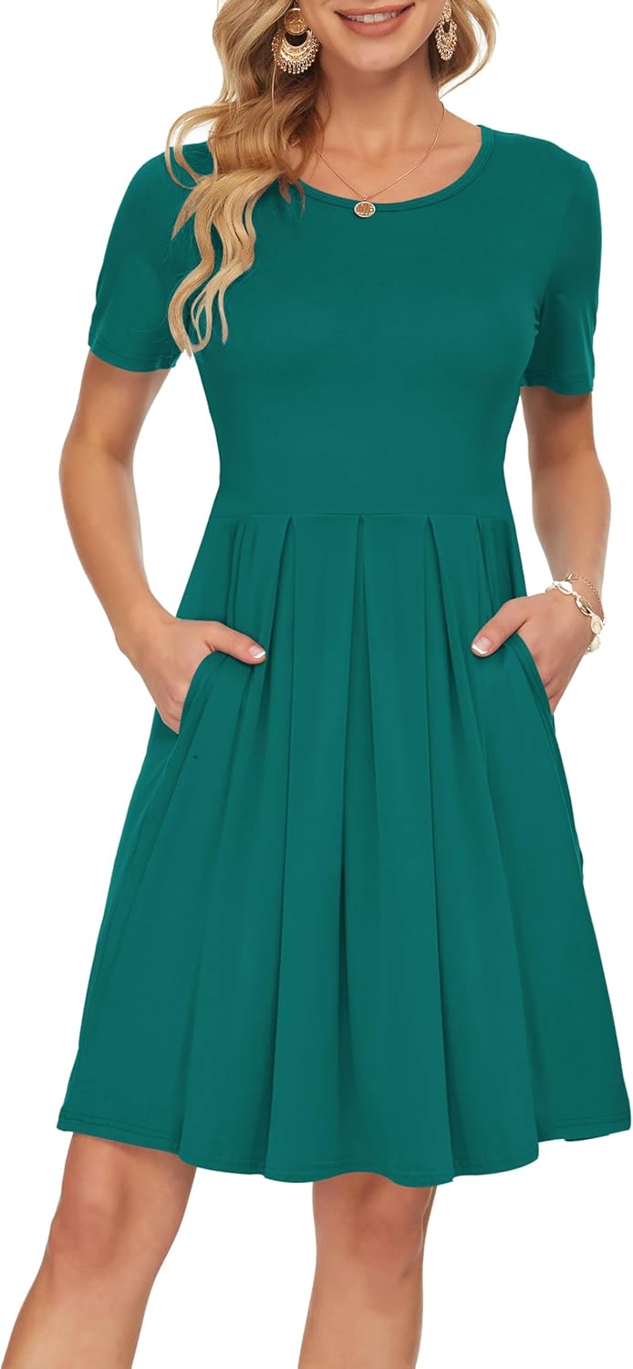 AUSELILY Women's Short Sleeve Summer Dress Pleated Loose Swing Knee Length Dresses with Pockets 2026 New