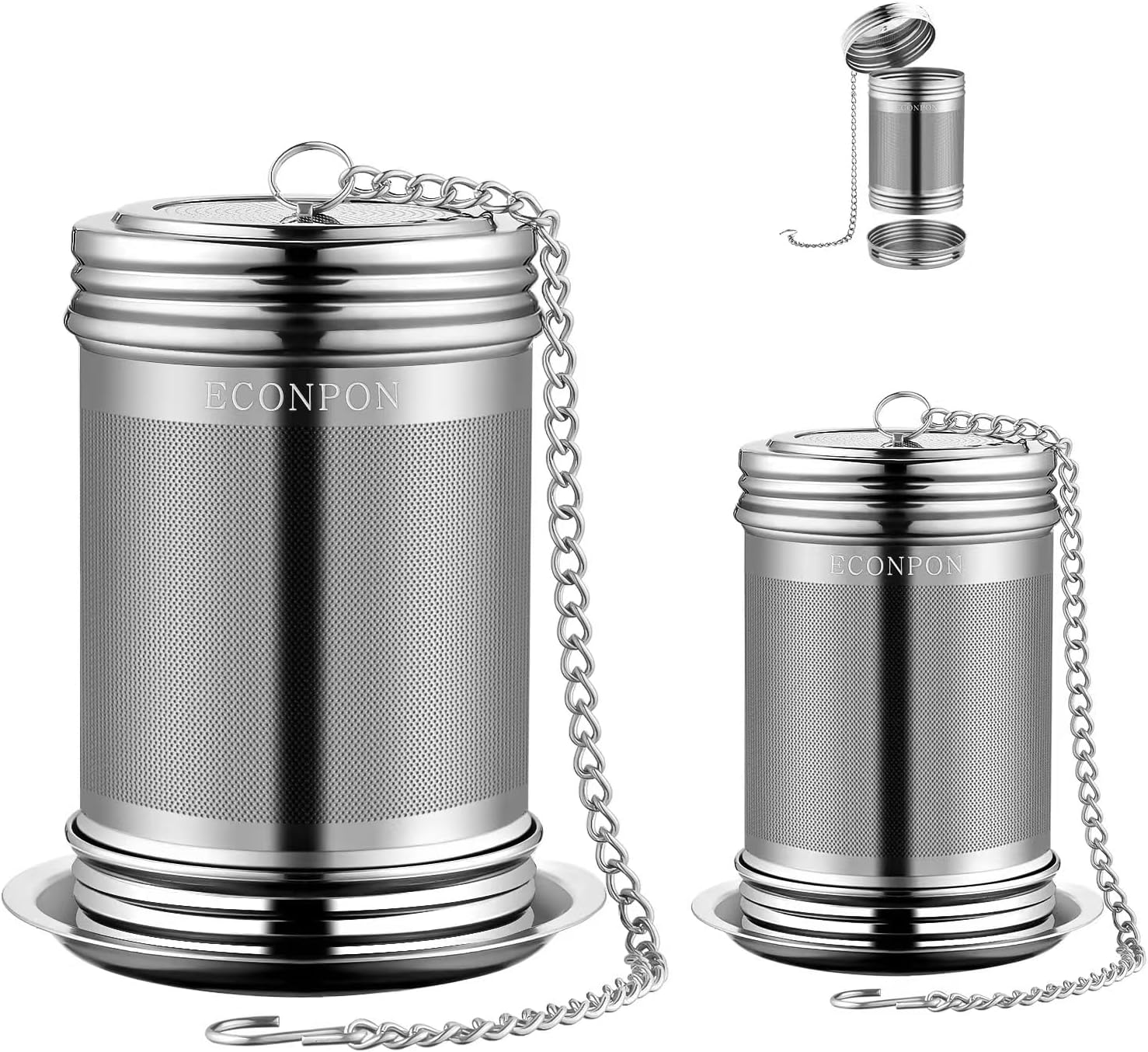 - Ideal Size and Perfect Function: The small stainless steel tea infuser is great for single cup, and the large size for you enjoy a teapot with friends. This strainer for loose leaf tea come with extended chain and s-hook facilitates dangling on your favorite vessel rim in brewing, when you remove the strainer there is a saucer for holding it to catch any drips, keeping your counter mess-free.